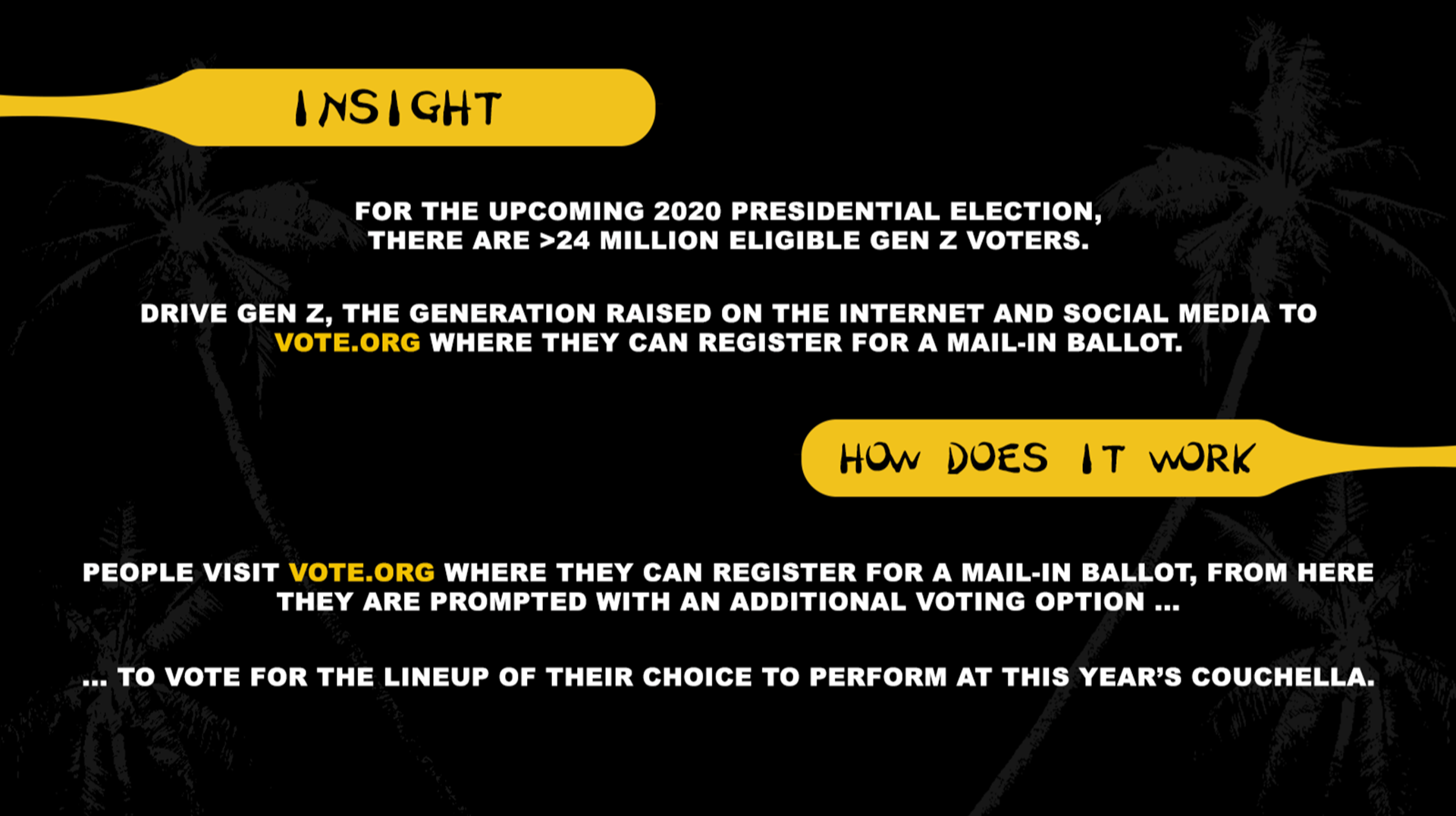 For the ONESchool for Creativity case study, I created a virtual Coachella experience that would help encourage GenZ voters to request a mail-in ballot and vote for the 2020 Presidential election.